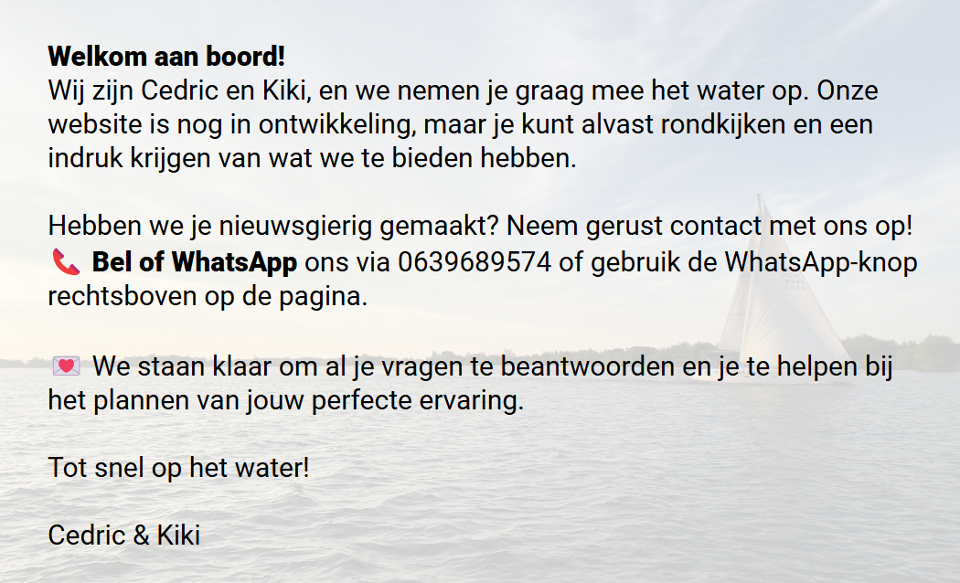 Ontdek onze missie en waarden: een passie voor zeilen die rust en luxe biedt. Dit drijft ons om unieke ervaringen te creëren, passend bij onze visie om uw avontuur op het water onvergetelijk te maken.